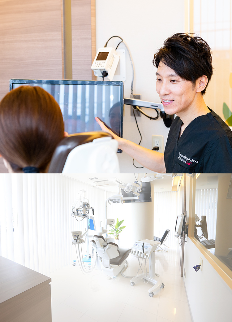 精度の高い治療を実現するためには、正確な検査・診断が欠かせません。当院では、歯科用CTやマイクロスコープ、セファロレントゲン、X-Guide、口腔内スキャナーなどの先端設備を活用し、お口の状態に合わせた治療をご提案しております。治療の説明はモニターを用いてわかりやすく丁寧に行い、患者さまが納得して治療を受けられるよう努めています。